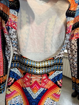 Vestitino con un design vivace e audace, perfetto per chi ama distinguersi. La schiena scoperta aggiunge un tocco di sensualità. - Stampa multicolor accattivante. - Modello a taglia unica che si adatta a diverse fisicità.