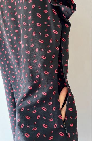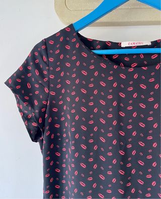 Vestito corto con una divertente stampa di labbra rosse su sfondo nero. Perfetto per un look audace e giocoso. - Fantasia labbra rosse. - Tessuto leggero e fluido. - Lunghezza spalle 39cm. - Lunghezza 92 cm.