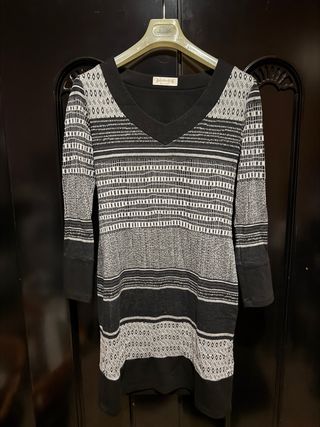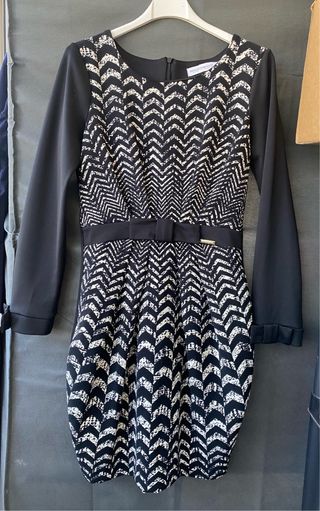 Elegante abito Rinascimento con fantasia a chevron. - Maniche lunghe nere. - Cintura con fiocco. - Tessuto leggero e confortevole, aderente ma elasticizzato. Usato pochissimo, come nuovo.
