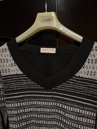 Elegante abito con una fantasia astratta in bianco e nero. Perfetto per diverse occasioni. - Fantasia astratta in bianco e nero. - Maniche a tre quarti. - Scollo rotondo.