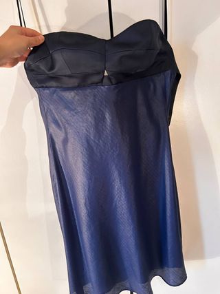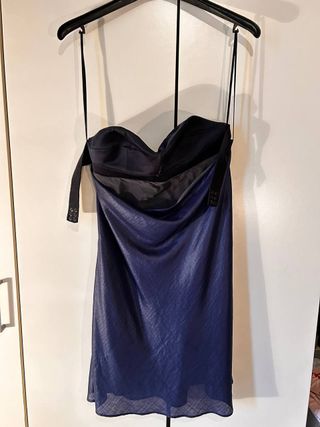 Elegante abito corto Emporio Armani. - Tessuto con finitura metallica blu. - Design a bustier. - Dettagli con bottoni sul retro, schiena scoperta. - vendo perchè purtroppo non ho più la stessa taglia, ma fu davvero un'ottima scelta e lo comprai nella boutique della rinascente
