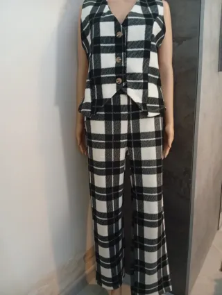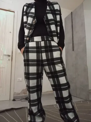 Elegante completo da donna composto da gilet e pantaloni con fantasia a quadri. - Fantasia a quadri bianco e nero. - Gilet con chiusura a bottoni. - Pantaloni con vita alta.
