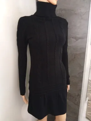 Elegante abito in maglia da donna, perfetto per ogni occasione. - Realizzato in misto viscosa e cashmere. - Design a collo alto. - Maniche lunghe. - Dettagli a trecce sul davanti. - Gonna a pieghe.