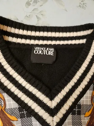 Abito corto con un design unico e ricercato. - Fantasia barocca dorata su sfondo a quadri. - Maniche lunghe in maglia nera. - Scollo a V con bordi a contrasto.