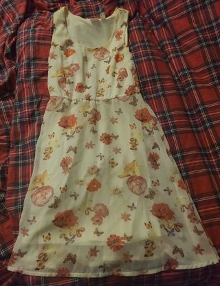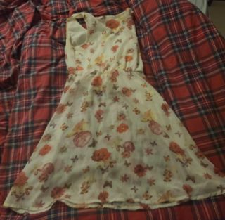 Delicato abito estivo con stampa floreale e farfalle. La vita è elasticizzata per una vestibilità comoda. - Tessuto leggero e svolazzante. - Scollo rotondo. - Maniche corte. In condizioni buone. Consegna a mano in zona Massarosa, Lucca, Viareggio e dintorni. Spedizione comoda in tutto il mondo