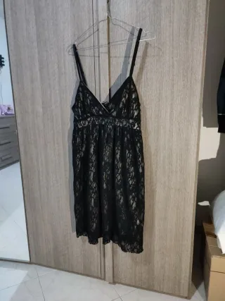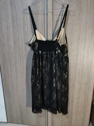 Elegante abito corto in pizzo nero e sottoveste dorata. - Scollo a V - Spalline sottili e regolabili - Tessuto in pizzo floreale