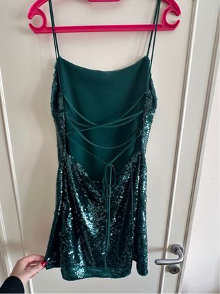 Abito corto Zara elegante, interamente ricoperto di paillettes verdi. Modello con spalline sottili, vestibilità femminile e luminosa, ideale per feste, serate ed eventi. ✨ Condizioni: ottime ✨ Effetto brillante e raffinato