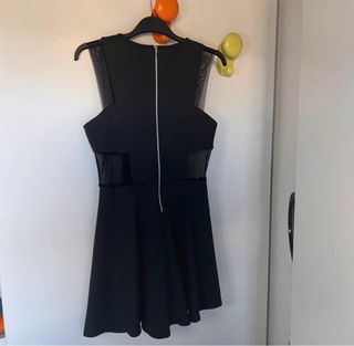Elegante vestito corto Guess Los Angeles. - Design smanicato. - Dettagli in mesh trasparente sui fianchi e sulle spalle. - Cintura sottile in vita. - Gonna svasata. Colore: nero. Scollo tondo, inserti in organza. Ottime condizioni. Ottima vestibilità. Indossato poche volte. Taglia: S.