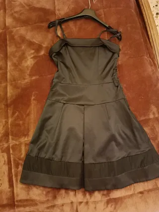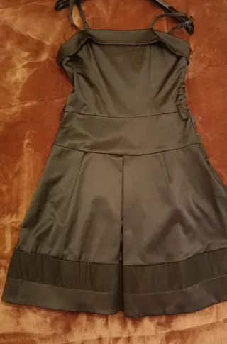 Elegante vestito nero, perfetto per occasioni speciali. - Tessuto satinato. - Spalline sottili regolabili. - Cintura in vita. - Gonna a pieghe.