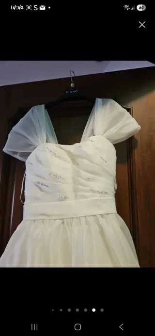 Elegante abito da sposa con dettagli scintillanti sul corpetto e gonna ampia. - Corpetto drappeggiato con applicazioni. - Maniche corte in tulle. - Cintura in vita. - Gonna voluminosa in organza. -vello piu un fioco in vita colore rosa