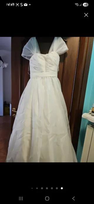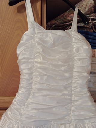 Elegante abito da sposa bianco, con un design classico e raffinato. Vintage da rinfrescare e riadattare ideale per feste in maschera - Corpetto drappeggiato con spalline sottili. - Gonna ampia e voluminosa. - Tessuto satinato lucido. Da lavare in quanto ha le macchie sul fondo e le macchie dovute al tempo passato