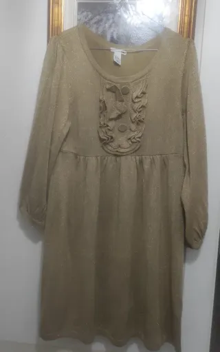 Elegante abito a tunica color oro, perfetto per occasioni speciali. - Maniche a tre quarti. - Dettaglio con rouches e bottoni sul davanti. - Tessuto leggermente scintillante.