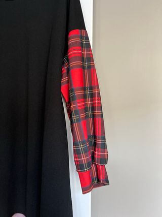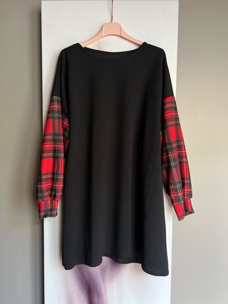 Abito nero a maniche lunghe a contrasto con fantasia a quadri rossi e neri. Nuovo.