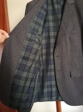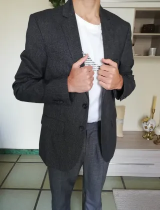 Giacca da uomo grigio scuro. - Chiusura a due bottoni. - Tessuto grigio con trama sottile. - Tasche esterne e interne - Polsini con bottoni.