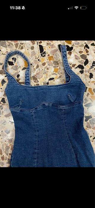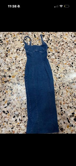 Abito lungo in denim Bershka, perfetto per un look casual ma alla moda. Indossato pochissimo, praticamente nuovo. - Tessuto denim resistente. - Design a tubino. - Spalline sottili.