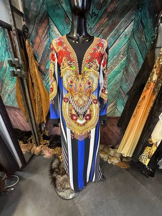 Splendido kaftano con una stampa vivace e dettagli preziosi, perfetto per eventi speciali. - Design con scollo a V. - Maniche lunghe. - Stampa multicolore con dettagli dorati e pietre. - Fondo a righe verticali blu, nere e grigie.