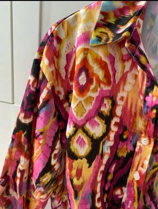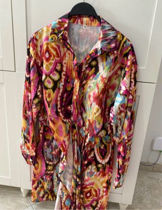 Vestitino con una fantasia vivace e colorata, perfetto per un look estivo. - Maniche lunghe. - Chiusura con bottoni. - Cintura in vita per definire la silhouette.