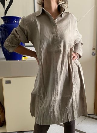 Abito a camicia lungo in tessuto leggermente stropicciato. Modello over - Maniche lunghe con polsino - Collo a camicia. - Chiusura con bottoni. - Vestibilità comoda.