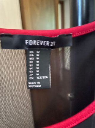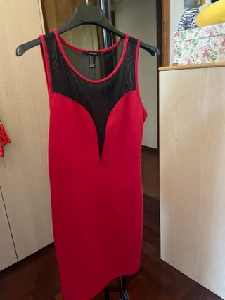 Elegante vestito corto con dettagli in mesh. - Tessuto principale rosso. - Inserti in mesh nero. - Scollo rotondo.