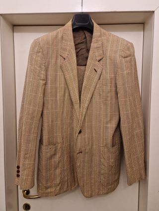 Set completo sartoriale artigianale composto da giacca, pantalone e gonna. - Tessuto a quadretti. - Giacca con chiusura a bottoni. - Gonna e giacca con pieghe (la giacca ha una piega sul retro).