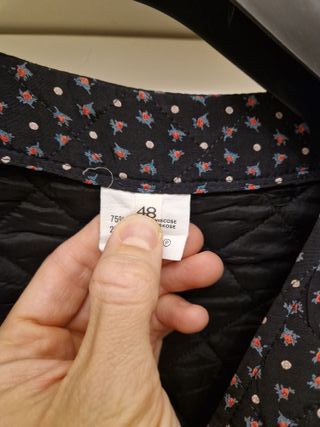 Elegante giacca da donna con un delicato motivo di roselline. - materiale 75% viscosa 25% seta taglia 48, lunghezza 67 cm - Chiusura con bottoni dorati. - Fodera interna trapuntata. - Tasche frontali applicate. - Maniche lunghe con risvolto.