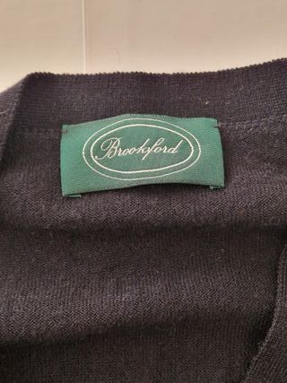Gilet uomo marca Brookfold colore blu notte taglia XL 54, misure lunghezza 70cm, larghezza torace 58cm, ottime condizioni eccetto per piccola cucitura accanto ad uno dei bottoni (vedi foto). 100 % Lana vergine