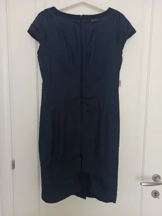 Elegante tubino blu, un capo classico e raffinato. - Dettaglio plissé sul corpetto. - Fiocco in velluto blu sul davanti.