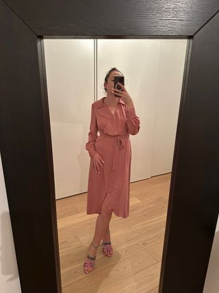 Elegante abito ASOS lungo, perfetto per ogni occasione. - Colore rosa tenue. - Cintura in vita per un fit personalizzato. - Maniche lunghe con polsini. - Tessuto leggermente testurizzato.