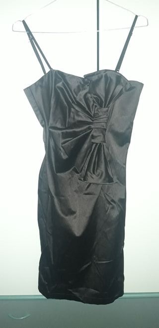 Vestito da sera corto a tubino. Dettaglio a fiocco sul davanti. Tessuto satinato lucido. Spalline sottili regolabili (una è da aggiustare).