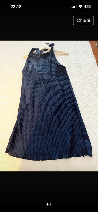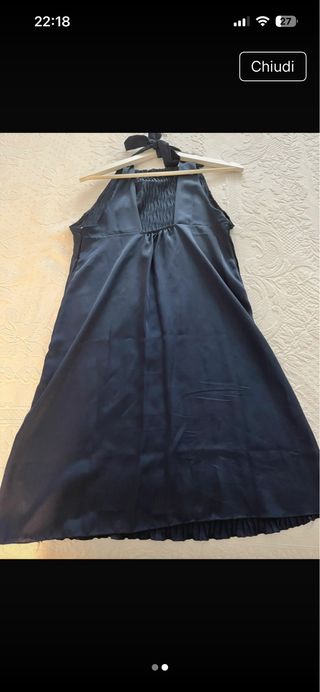 Abitino corto in tessuto blu, perfetto per le serate estive. Si allaccia al collo con un fiocco. - Tessuto leggero e fluente. - Dettaglio arricciato sul corpetto. - Modello senza maniche.Taglia 42.