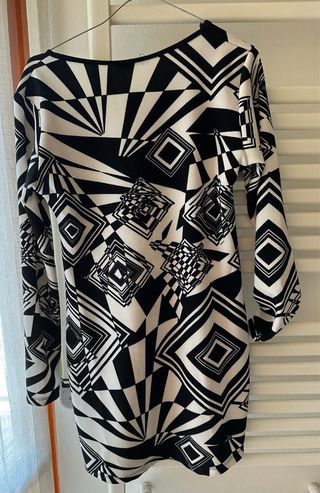 Abito Esmara in maglia, nero con bordi bianchi, lunghezza poco sotto al ginocchio (io sono alta 1,68). Veste una M-L (42/44 italiane). 82% viscosa, 18% polyamide. Usato una volta. ⚠️Prezzo non trattabile. La foto in cui lo indosso non è molto nitida, ma nelle altre si vedono bene i dettagli.