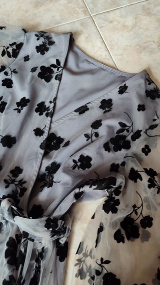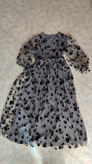 Bellissimo vestito lungo, mai indossato, taglia L. - Motivo floreale nero su sfondo grigio chiaro. - Tessuto leggero e arioso, ideale per la primavera/estate. - Maniche a palloncino. - Chiusura a fascia in vita.