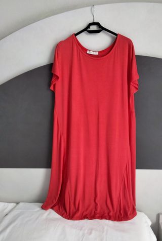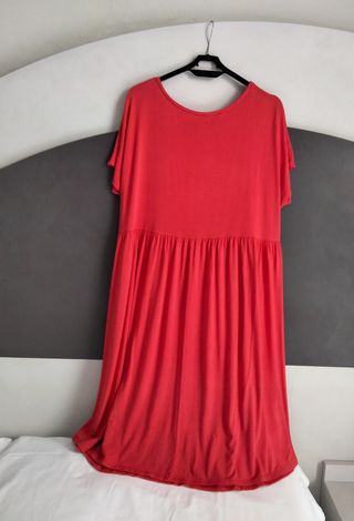 Bellissimo vestito estivo color corallo, tessuto maglina di cotone misto viscosa con elastan, con arricciature in vita sul retro. Marca New Collection, Made in Italy. È praticamente nuovo perché indossato solo due volte. Taglia unica, ecco le misure: larghezza sotto ascelle cm 50, in vita circa cm 53/55 e poi si allarga con ampia vestibilità (all'altezza dei fianchi è almeno 62/63 cm, poi anche di più per le arricciature). Lunghezza cm 94. - Vestibilità comoda e morbida. - Tessuto leggero e fresco. - Lunghezza al ginocchio. - Maniche corte.