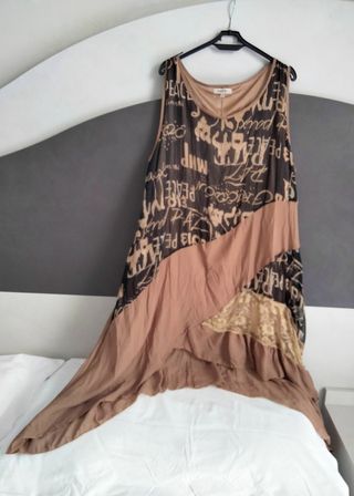 Bellissimo vestito marca Sweet Miss senza maniche, con una linea asimmetrica. Usato pochissime volte, pari al nuovo. Taglia L/XL, ecco alcune misure: larghezza sotto ascelle circa cm 60, poi si allarga con ampia vestibilità. La lunghezza è variabile essendo asimmetrico, è lungo sui fianchi e più corto davanti e dietro, dettagli in foto. Ha un laccetto decorativo sul retro e ha una fodera tipo maglina leggera. - Perfetto per un look casual chic. - Modello estivo e leggero. - Stampa con scritte in nero e beige. - Dettagli in pizzo.