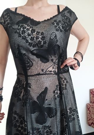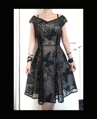 Abito gothic in stile retrò, in pizzo nero con motivi floreali e farfalle, fodera beige chiaro. Spalle leggermente scoperte, lunghezza poco sotto al ginocchio. Chiusura con zip sul retro. Nastro nero sul retro sotto alle spalle da legare a fiocco. Taglia L (➡️controllare misure in ultima foto). 🛑Anche se dalla prima foto sembra che a me vesta giusto, in realtà mi sta parecchio largo sia sul torace che in vita (vedi seconda foto) e non è quindi adatto a taglie inferiori rispetto a quella segnata. ⚠️Prezzo non trattabile.