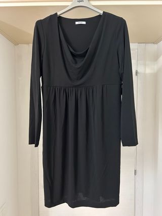 Elegante vestito nero con scollo a cascata e maniche lunghe. La parte superiore è aderente e la gonna è svasata. - Scollo a cascata morbido. - Maniche lunghe. - Gonna svasata con pieghe.