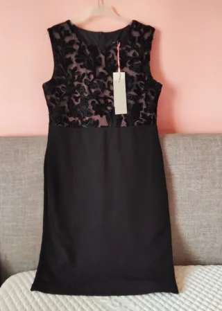 Abito a tubino con inserti in pizzo nero AnnaRita N, stretch, con spacchetto sul retro e chiusura a zip. Lunghezza sopra al ginocchio. Sotto il seno, solo sulla parte davanti, c'è un cinturino nero elastico con funzione decorativa. Taglia S (40) ITALIANA, comunque controllare le misure nelle foto.
