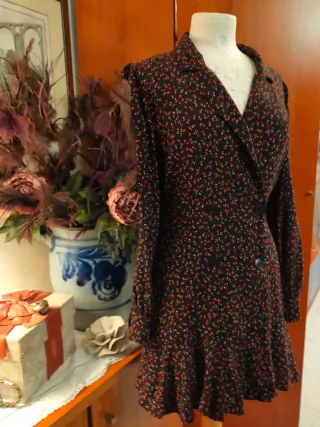 Elegante abito con una fantasia vivace. -La taglia riportata è una S,ma veste comoda, consiglio una M, alcune misure lasciate in foto. - Scollo a V. - Maniche lunghe. - Chiusura con bottoni. - Gonna svasata.