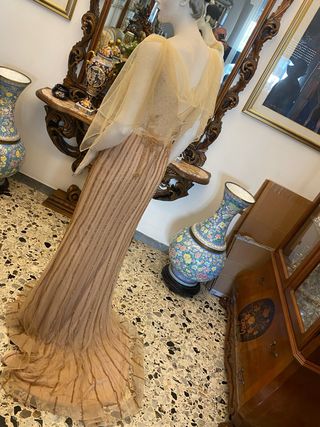 Elegante abito da cerimonia da donna, perfetto per occasioni speciali. - Tessuto leggero e scintillante. - Dettagli ricamati e perline. - Lunghezza maxi con strascico.