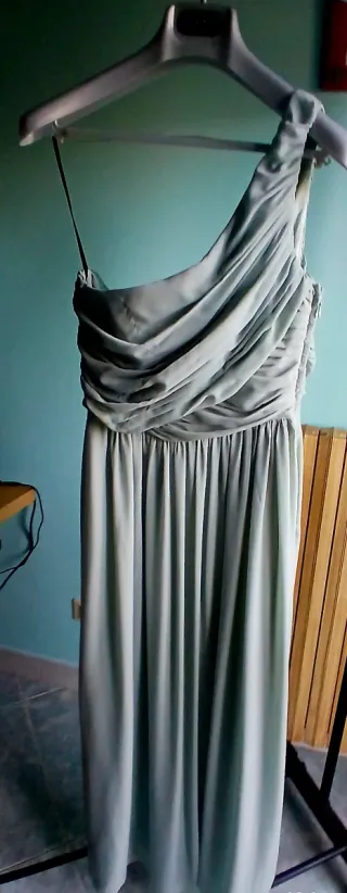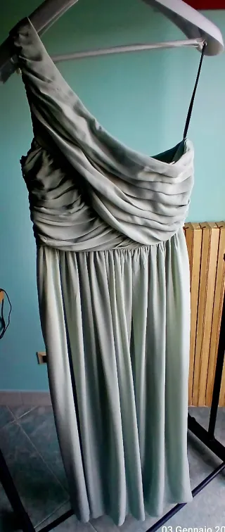 Vendo splendido abito lungo monospalla color verde salvia/menta, caratterizzato da un corpetto finemente drappeggiato e una gonna fluida che dona un movimento bellissimo. Condizioni: Ottime, praticamente pari al nuovo. Storia del capo: Acquistato nel 2014 per un'unica esibizione di ballo e poi riposto con cura nell'armadio. Non è mai stato indossato per altre occasioni. Stile: Dea greca, molto elegante e chic. Perfetto per damigelle, invitate a matrimoni, serate di gala o esibizioni. Vestibilità: TG. Riportata sull etichetta è la 44 del brand che corrisponde una 48 ma veste una 46/48. Il tessuto è leggero e cade morbido sull