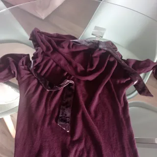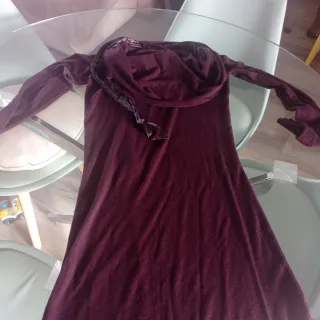 Elegante abito da cerimonia in un bellissimo color prugna. Il tessuto satinato dona un tocco di lusso. Usato solo per un evento. Da ricucire una bretellina e l' orlo in basso come in foto. - Scollo a V incrociato. - Gonna ampia e fluida. 139 lunghezza da spalla a piede 70 vita 91 seno