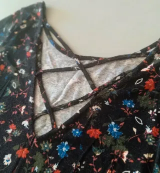Vestito corto con fantasia floreale su fondo nero. Presenta una fascia in vita con zip. - Maniche corte. - Scollo rotondo. - Tessuto elasticizzato.