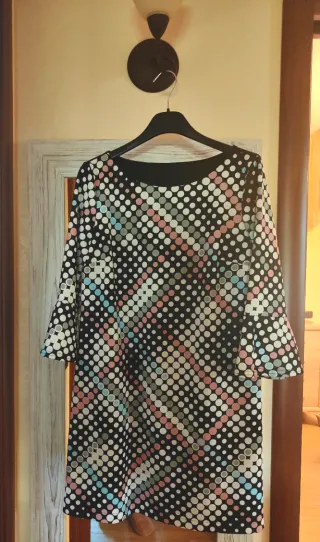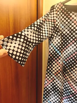 Vestito con fantasia a pois multicolore su fondo nero. - Maniche a tre quarti con balza. - Scollo rotondo. Circonferenza all' altezza del seno e dei fianchi più o meno 96 cm Lunghezza 83 cm Lunghezza della manica 45 cm