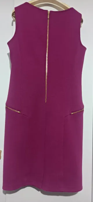 Elegante abito fucsia con dettagli zip dorate, foderato, presenta sulla spalla sinistra, come da foto, dei punti aperti, (eventual. riparazione a carico dell' acquirente) non visibile sotto un cardigan o giacca, è stato accorciato. Misure: spalle cm. 36, ascella a ascella cm. 46, punto seno cm. 44, vita cm 42, fondo cm. 51, lunghezza cm. 92.