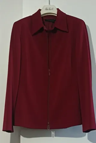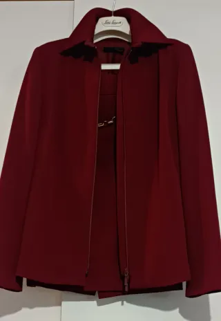Bel completo Luisa Spagnoli con chiusura frontale con zip. Colore bordeaux sfiancato e dettaglio con catenella sulla gonna con tasche a filo. Misure:Tg. 46 It, Giacca :spalla cm. 13, spalle cm. 42, lungh. cm 64, punto seno cm. 50, vita cm 46, fondo cm 55, lungh. manica cm .63. Gonna: vita cm.42, bacino cm.47, fondo cm.45, lungh. cm. 56. Parzialmente foderato, la catenella può risultare leggermente sbiadita, lieve alone non visibile sul collo e riparazione interna sulla fodera della gonna non visibile dall' esterno, come da foto.