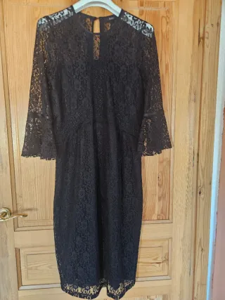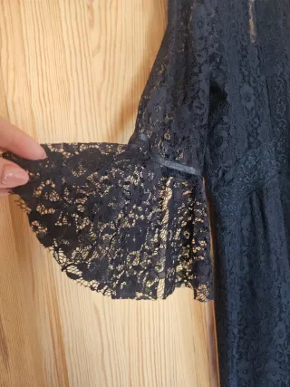 Elegante abito in pizzo nero Seventy. - Tessuto in pizzo floreale con fodera. - Maniche a tre quarti. - Dettagli in pizzo sul collo e sui polsini. - Lunghezza al ginocchio. - Indossato poche volte.