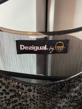 Elegante vestito Desigual con dettagli di paillettes sullo scollo. - Tessuto leggero e fluttuante. - sotto abito nero integrato. Presente qualche segno di utilizzo come in foto e una macchietta.