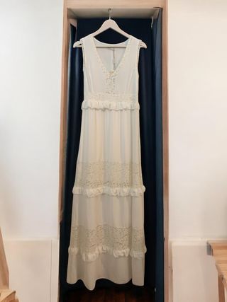 Elegante abito lungo Fracomina, perfetto per ogni occasione. Realizzato con cura per un look sofisticato in tessuto leggero, con bordi di pizzo macramè e piccoli volant, scollo a V con incrocio, zip al fianco. Un abito lungo poetico perfetto per la stagione. È in misto cotone leggero, con bordi di pizzo macramè e piccoli volant in tessuto e ha lo scollo a V incrociato davanti, il taglio in vita, la zip al fianco, foderato. Misure: Spalle 37cm. Vita/Sottoseno 37cm. Da ascella ad ascella 41cm. Lunghezza 154cm.