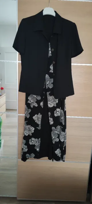 Elegante abito lungo con una stampa floreale astratta su sfondo nero. Il vestito presenta uno spacco laterale e un sopra abito in fantasia che aggiunge movimento. giacchino nero coordinato sfiancato con chiusura di bei bottoni sul davanti Tessuto leggero e ingualcibile per primavera/estate
