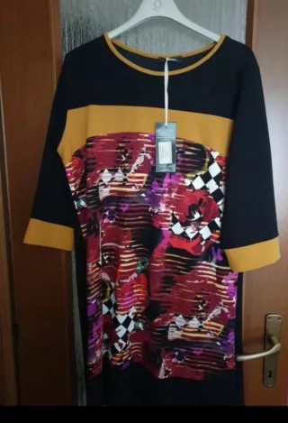Abito con scollatura tonda e maniche lunghe. A me che sono alta 165 cm arriva appena al ginocchio. La stampa principale è un classico motivo a fantasia cachemire (o paisley) con colori che includono blu, bordeaux, beige e accenti marroni con una bordura decorativa a fantasia diversa sull'orlo e sui polsini. E’ realizzato in morbida e calda maglina, che garantisce una vestibilità comoda. Usato pochissimo e in condizioni perfette.